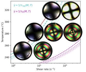 Abstract: Polymer melt processing often requires conditions of temperature and shear that create flow-induced structures which deeply affect the properties of the resulting material. Such effect is connected to chain stretching, often leading to shear-induced nematic alignment of at least the longest chains, reported for rod-like polymers but also polyolefins. The chain stiffness of a polysulfone melt is numerically determined from the tangent correlation decay along a freely rotating chain model. Its reasonable chain stiffness and linearity, verified by very good agreement of the linear viscoelastic data with a branch-on-branch (BoB) tube model, as well as its inability to crystallize make it a suitable material to explore the temperature dependence of the nematic alignment. Such behavior is monitored by both rheology, exhibiting a failure of the Cox-Merz rule, and birefringence by means of an in situ reflection polariscope. The critical shear rate for nematic alignment at various temperatures is determined and contrasted with that expected from the Rouse relaxation time of the longest chains, often considered as the control parameter. Although the onset shear rate for nematic alignment share the same temperature dependence as the chain relaxation times, suggesting chain stretching is the underlying mechanism, the critical shear rate is much smaller than expected. The anomalous behavior of polysulfone is discussed in relation with possible π-stacking interactions stabilizing the nematic domains.